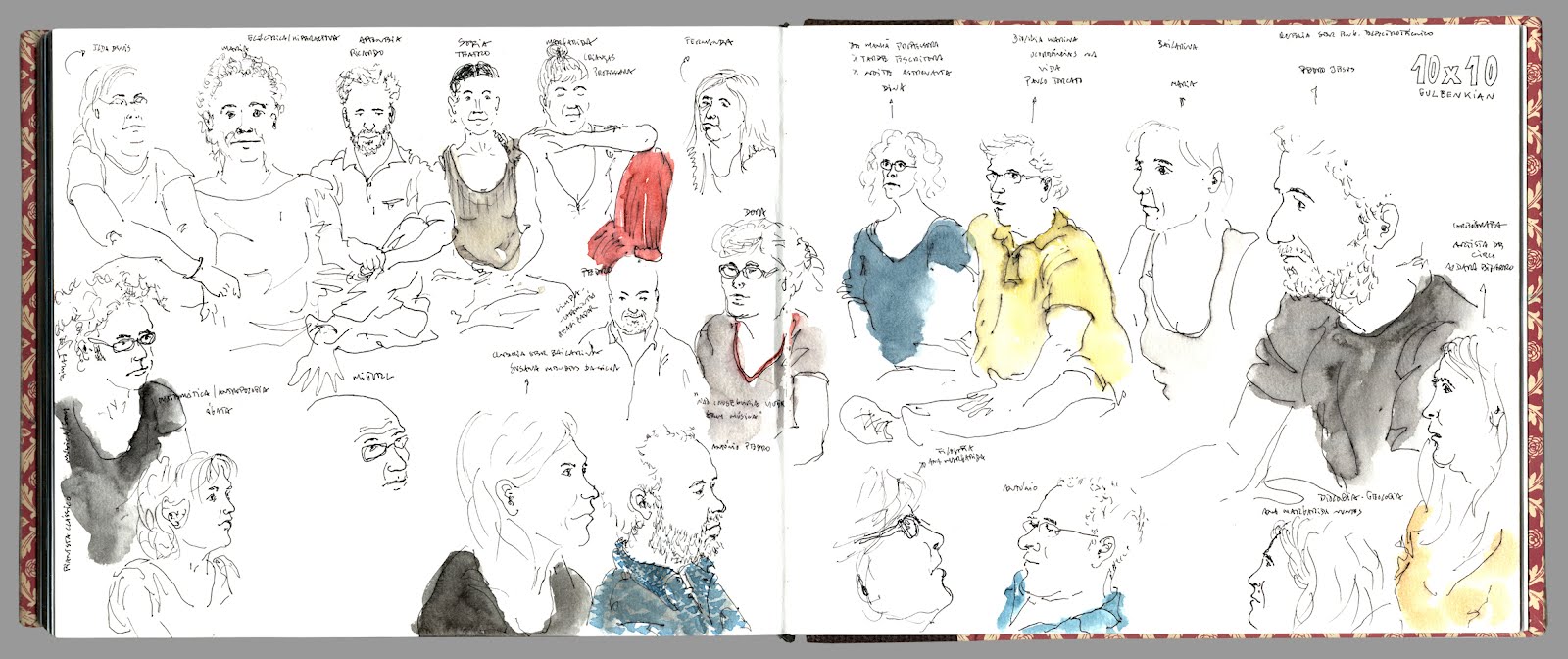 Desde dia 16 que tenho estado em residência artística na Gulbenkian com o projecto 10x10. Como acaba só amanhã não vou conseguir ir ao encontro de diários gráficos para desenhar os Tall Ships, mas apareço por lá a partir das 19h00.No primeiro dia houve, como não podia deixar de ser, o clássico momento de apresentação. Propus-me desenhar as pessoas enquanto elas falavam. O Miguel, por exemplo, falou tão rápido que teve mesmo de ficar inacabado...